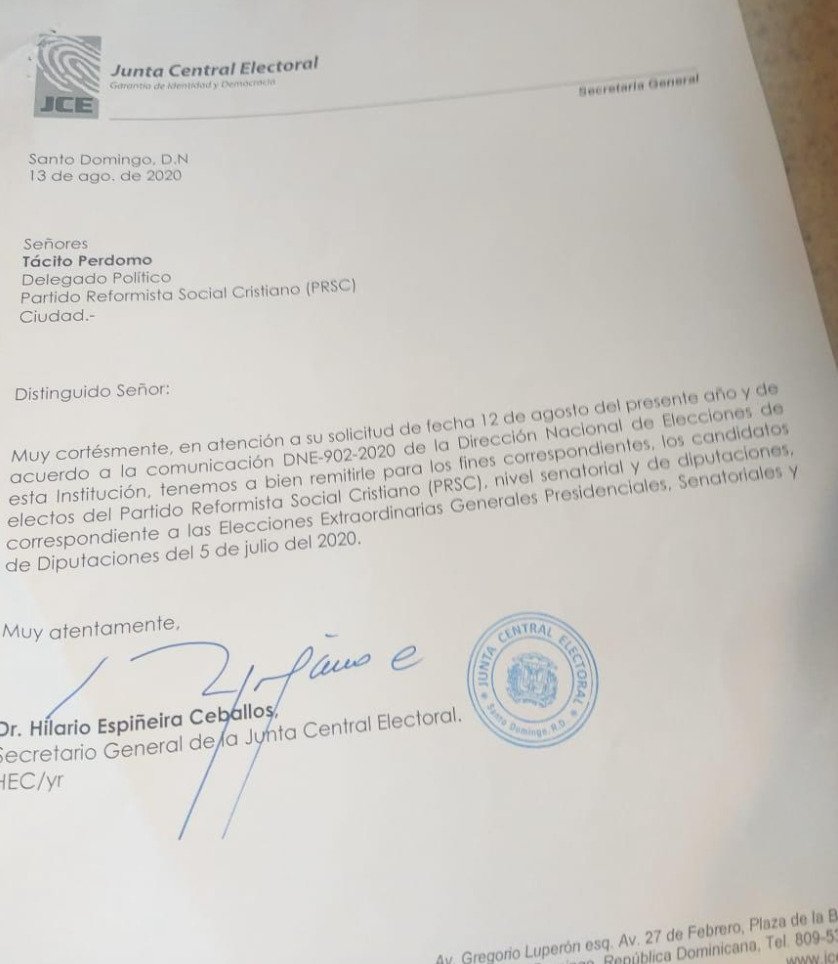 SANTO DOMINGO.- El senador y secretario general del Partido Reformista Social Cristiano, Ramón Rogelio Genao, informó este viernes que la Junta Central Electoral (JCE) entregó a esa organización política una certificación de los seis senadores que corresponden al PRSC, lo que le asegura la segunda mayoría en el Senado de la República.
